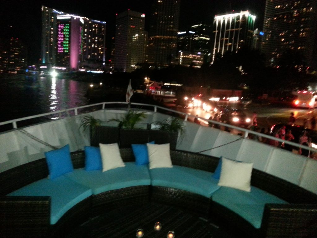 If you’re looking for the ultimate party vessel for an unforgettable boat party, this theme yacht encompasses the luxurious atmosphere of a tropical charter yacht, while resembling a south beach night club and a boutique art-deco banquet space. Cabana beds and jumbo palms on the top deck are the main attractions, with flexible cruising from Miami to West Palm, perfect for all occasions and groups of 50-300. (Maximum capacity is 380) Yacht is also very popular for upscale DJ parties in Miami during Winter Music Conference, Ultra Fest, and Carnival Columbus Day Weekend.
