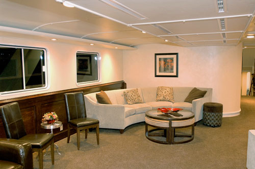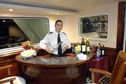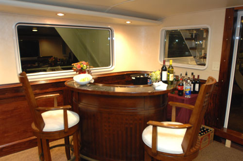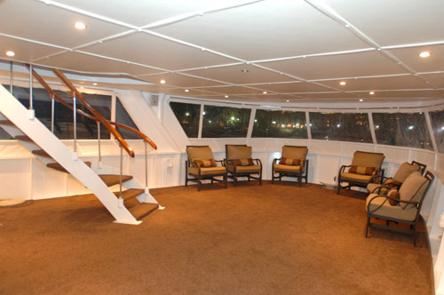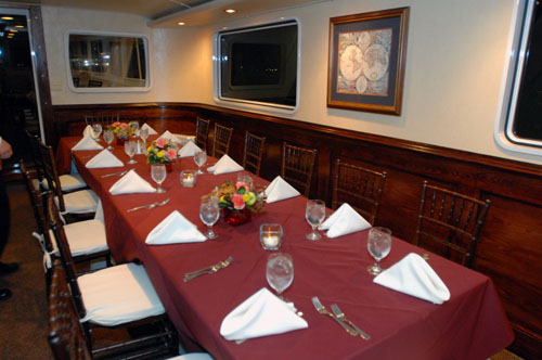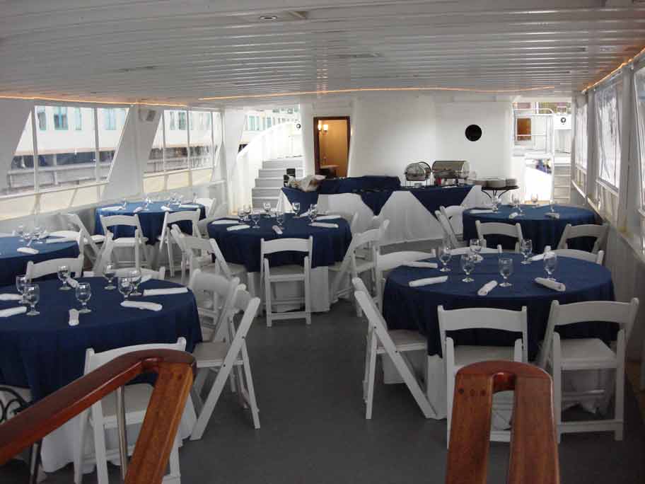 Refurbished in 2007 Steel Length: 120 ft. Beam: 24 ft. U.S. Coast Guard Certified for 149 passengers plus crew Climate controlled Main Salon, buffet Salon, Bridal Suite Wrap around covered Teak side Decks Top Deck: 72’ x 24’ with open air Aft Two full service bars – one on each deck State of the art Sound System throughout Satellite TV with DVD, and Power Point capability displayed on 52” LCD in Main Salon and two 32” LCD on top deck Four bathrooms Movable furnishings throughout yacht