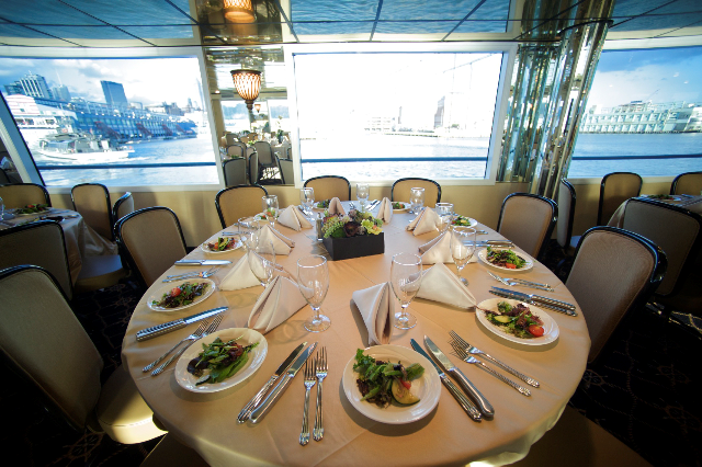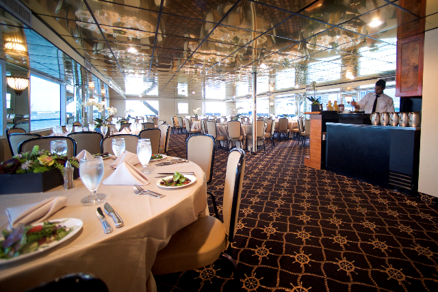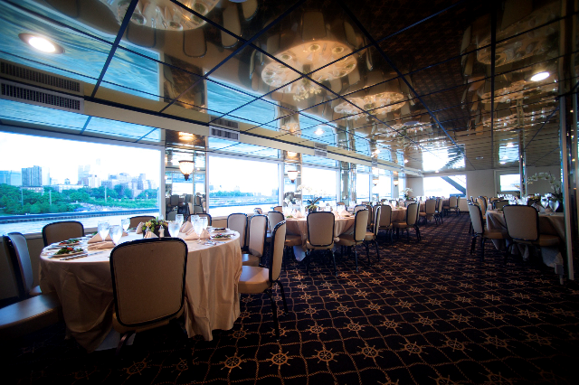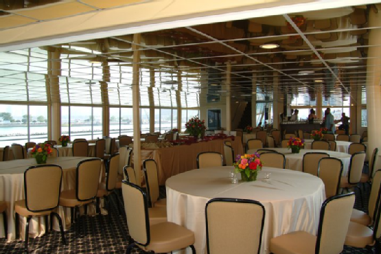 The second level is the Dining Room where we can comfortably seat from 75 up to 250 guests. Whether you prefer a sit-down dinner or a buffet we can easily accommodate for your event. The dining room features large picture windows throughout from which passengers have a panoramic view of the harbors and city skyline.