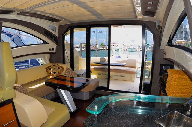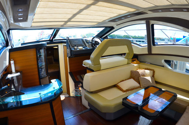 Want to cruise through the waters on the most lavish chartered yacht? Millionaire’s Concierge can put you in the lap of luxury. Enjoy the lifestyle of the rich and famous, where our friendly and professionally trained staff will accommodate any request. The styling is sharp, if a bit futuristic, with everything from the backrest of the bench-style helm chair to the corner moldings on the full-beam, hinged and bi-folding glass doors comprised of rigid angles, as if the interior designers had been inspired by the angles of a honeycomb. But unlike a beehive, the 40 won’t feel cramped, especially in the saloon, thanks to the open, flowing feeling that results from the combination of the 6’6″x11’3″ retractable sunroof and the aforementioned glass doors. Please note, unlike our competition, all of our pricing includes tax, gratuity and service charges. Options: