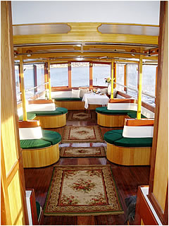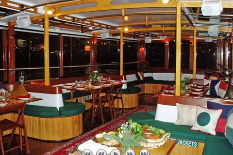 This gorgeous, buff-hulled 80-foot, Twenties-style yacht offers elegance and comfort, wrapped in turn-of-the-century tradition. She is equipped with teak decks and mahogany trim. Her spectacular cabin features an all-glass observatory, cushioned seating, conversation-friendly tables, and a well-appointed bar; all of which provide you and your guests with stunning panoramic views within climate-controlled comfort.