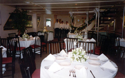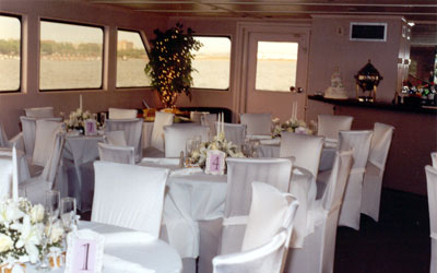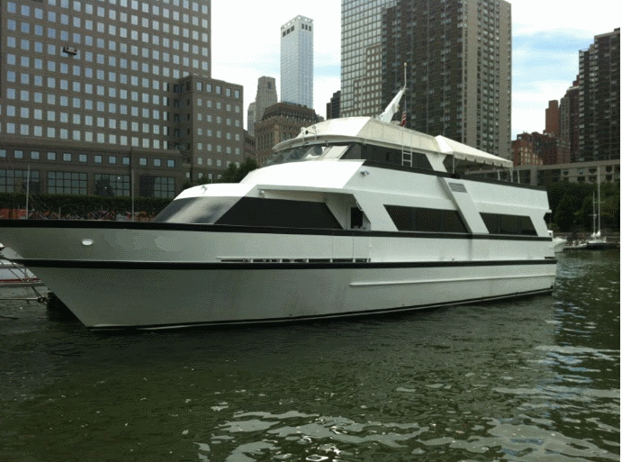 This is a beautiful yacht to have your next event on. This is a custom-built luxury yacht, with all the amenities of a fine ship. It is available for private parties in the NYC area and NJ. It is equipped with 3 floors. The main Dining Room Floor has a full service bar, with black granite top and premium liquors. It has comfortable seating for up to 75 guests at formal tables. It also features couches and cocktail tables in the aft. The buffet table is built in, with black granite tops. The galley is right the dining area, so your food is the freshest it can be. Our galley is staffed by the gourmet chef that cooks up the finest of dishes. The lower lounge has couches, cocktail tables, and formal seating for Twelve guests. The top floor has a private room, which can act as a bridal suite, complete with bathroom, vanity, and a comfortable couch. Aft of the private room is an outside deck, which doubles as a dancefloor with bench seating all around, a DJ sound system, and lights. Cocktail tables surround the perimeter of the dancefloor. A tent covers the dance floor and plastic curtains can be drawn in case of inclement weather. At the bow of the yacht, on the main floor, There is cushioned seating that is excellent for enjoying the NY Harbor city tour. This yacht is intimate enough for any private party, and is perfect for a sit down dinner from 2-70 guests, for a buffet up to 80 guests, and a cocktail Hors d’oeuvre party of up to 100 guests. Since this yacht was custom built for the NY Harbor, you can be sure that it is a very comfortable ride and has the finest of staff.