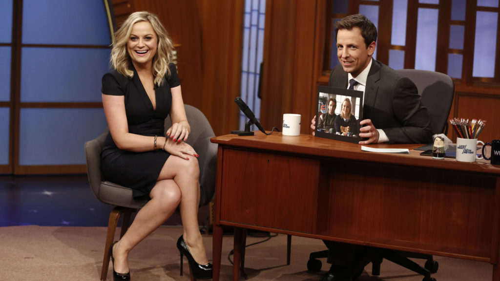 The series is the fourth incarnation of the Late Night franchise, originated by David Letterman. Meyers was appointed host when Jimmy Fallon was announced to become the next host of The Tonight Show (currently The Tonight Show Starring Jimmy Fallon), where he succeeded the previous host Jay Leno on February 17, 2014. Meyers’ first guests were fellow SNL alum and Weekend Update co-anchor Amy Poehler, Vice President Joe Biden, and musical act A Great Big World. The show’s house band, The 8G Band, features members of the indie bands Les Savy Fav and Girls Against Boys, and is typically led by SNL alum Fred Armisen. Every episode features a coffee mug on Meyers’ desk from a different NBC affiliate.