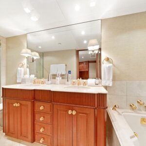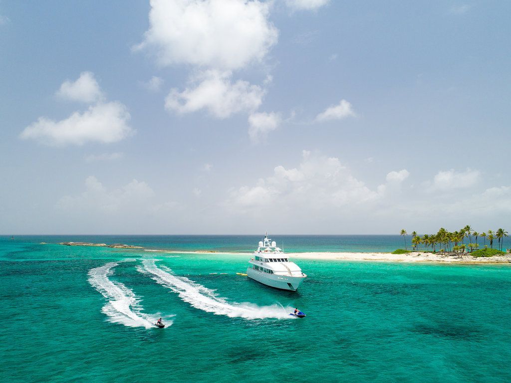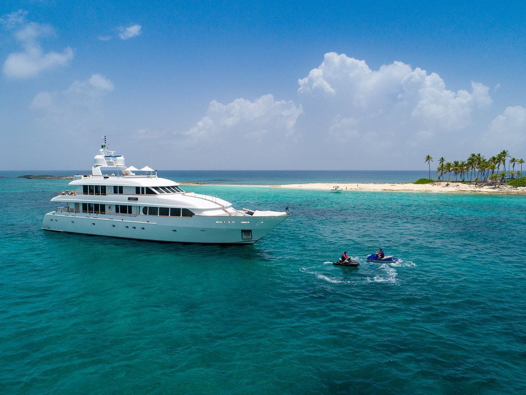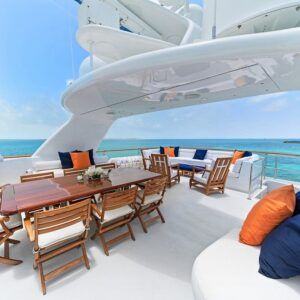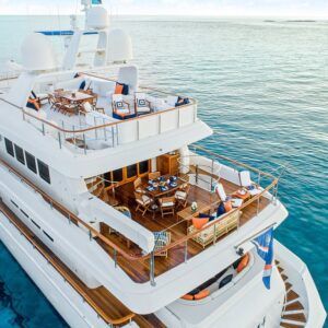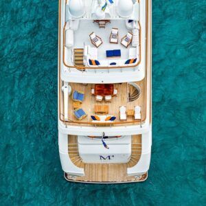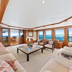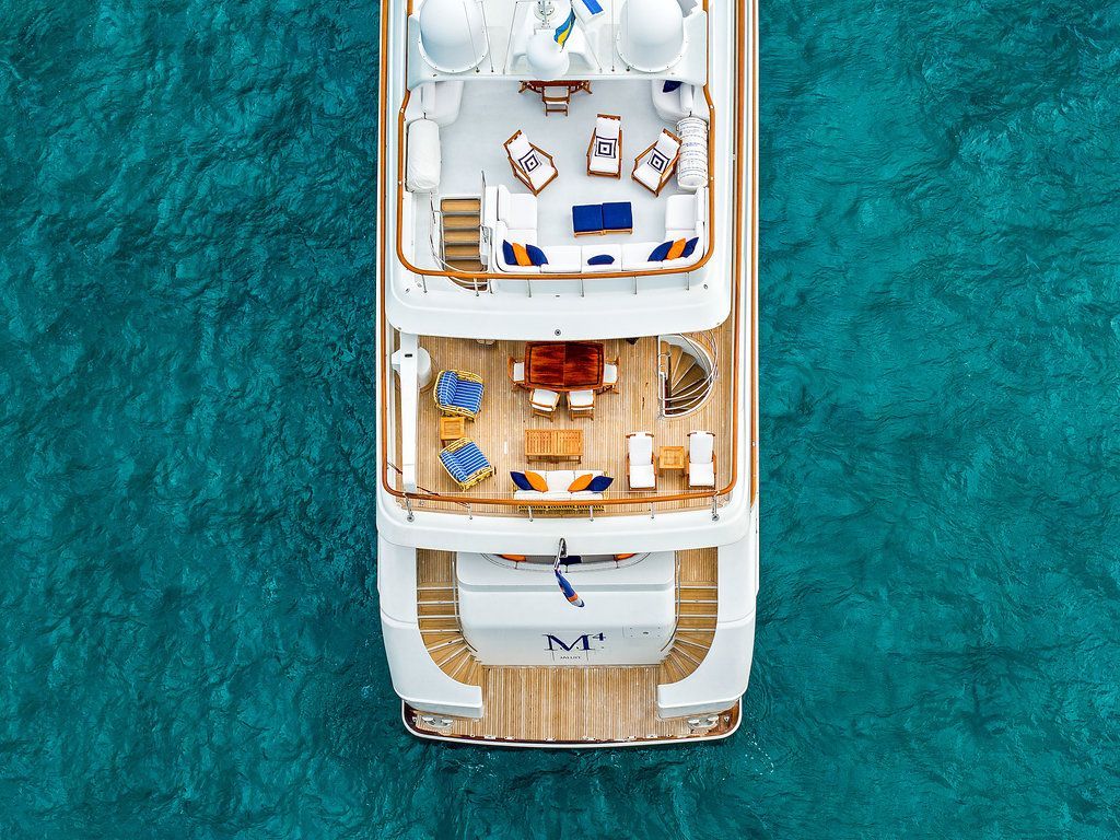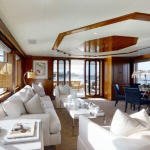 M4 is a fine example of pure yachting pleasure. Mingle with friends, or kick back and relax in one of the many spacious indoor and outdoor lounging areas located on multiple decks. Large floor-to-ceiling windows flood the interior with light and allow you to enjoy the views. A beautiful curved stairwell, located at the forward end of the lounge leads down to the main deck and the guest accommodations. The main stairwell between the yacht’s three decks is located centerline between the salon and dining areas. The stairwell breaks up what would normally be a monotonous surface and at the same time provides excellent access between the yacht’s three decks. The upper deck lounge includes a full bar and game and dining table to the left with comfortable couches and chairs, with large TV for movie watching. Full-length windows give this area a great view.